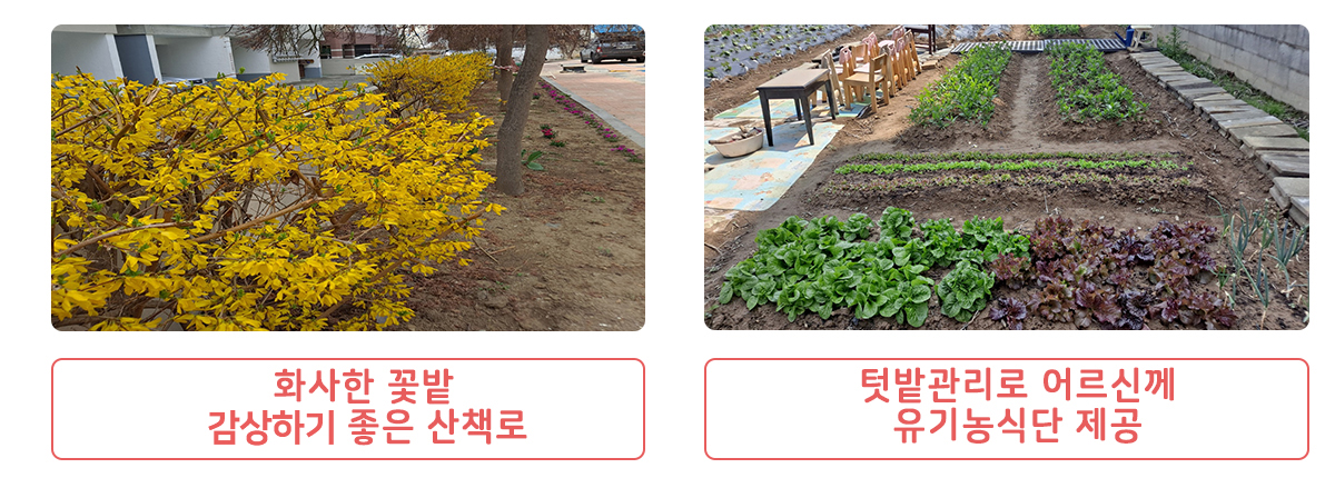 센터에서 텃밭에 다채로운 작물들을 직접 경작하여 식자재를 공수 어르신들께 유기농식단을 제공