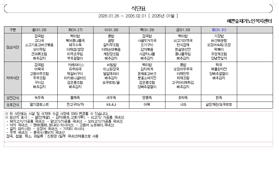 2026 1월 5주차 식단표